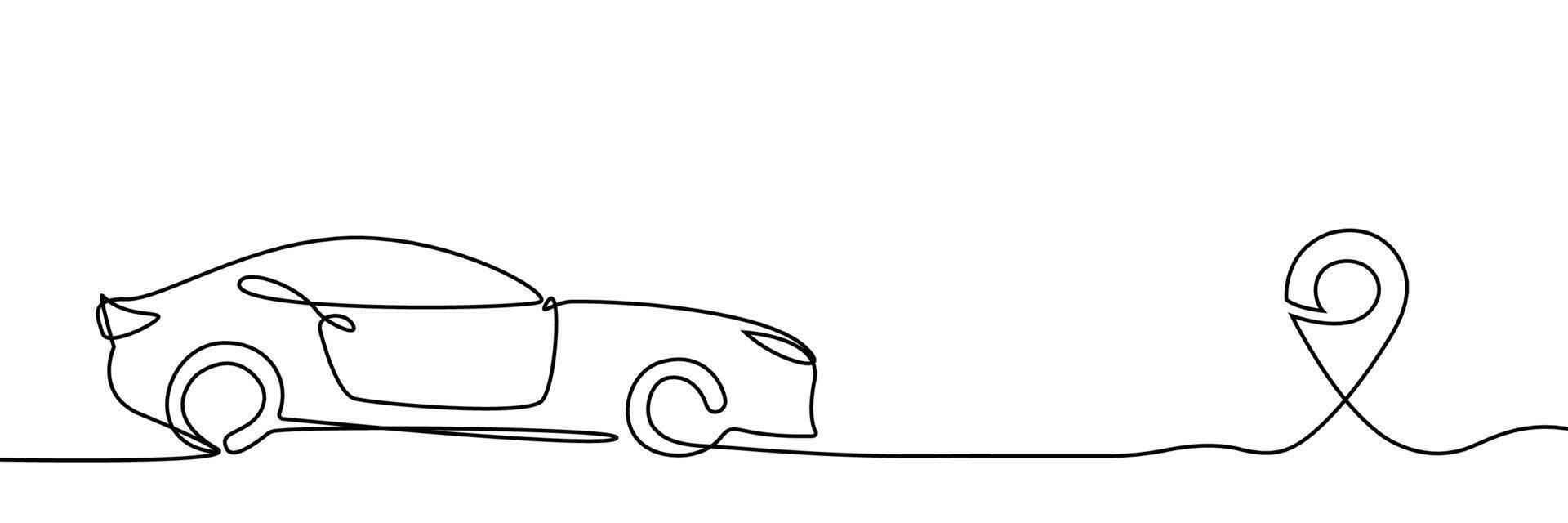 Continuous one line drawing car path to location pin pointer. Reach the goal concept. Travel concept. Vehicle road to location pointer. Oneline car. graphic. EPS 10 Pro Vector