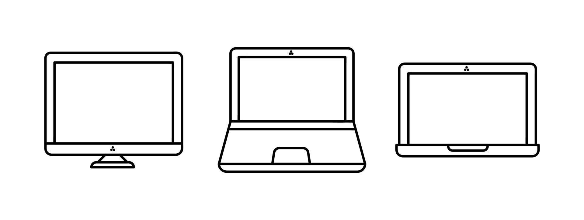 Desktop computer and laptop icon set. Modern simple computer collection linear icon set ready as template. Download simple linear computer vector. white background. Angled view Pro Vector