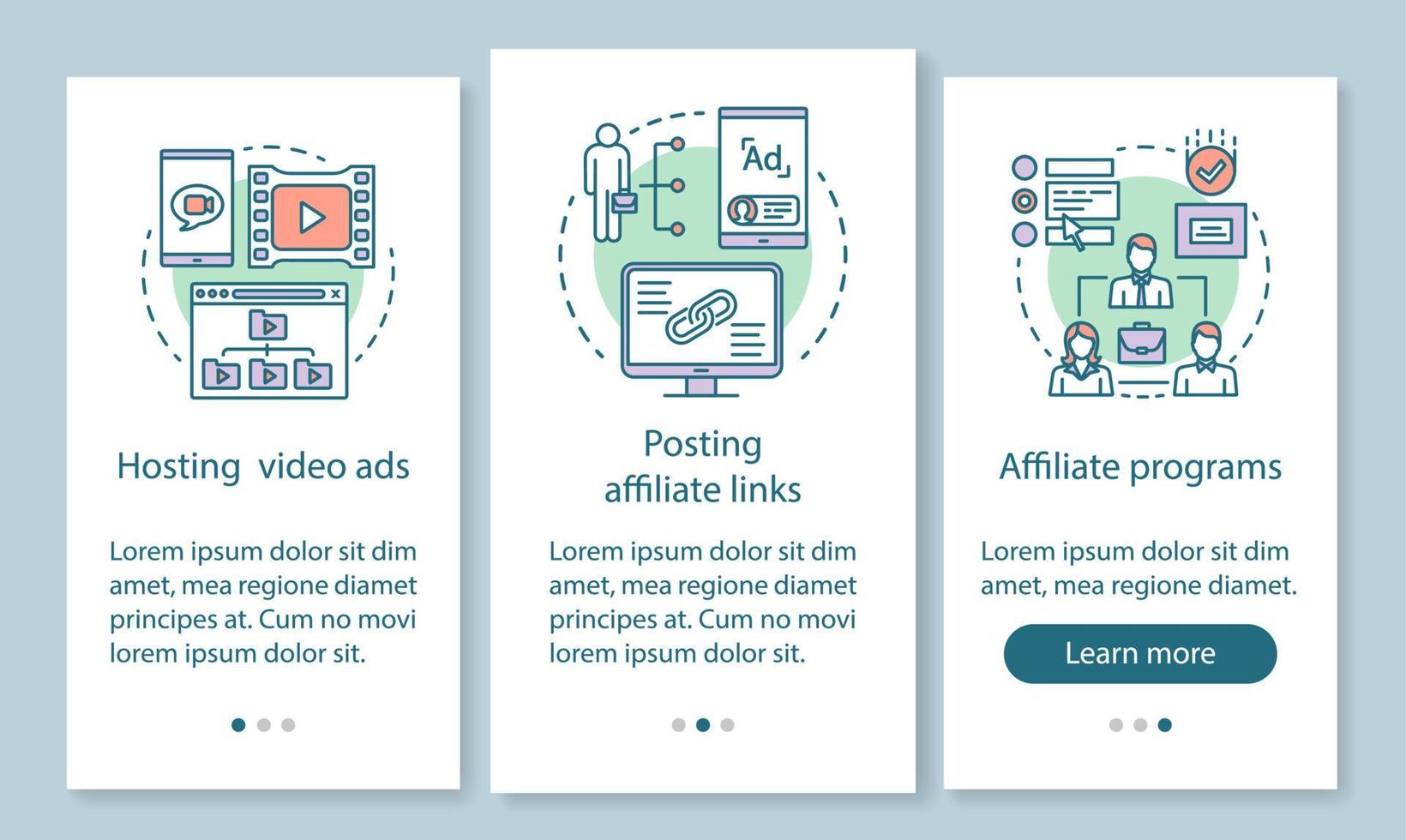 Affiliate marketing onboarding mobile app page screen with linear concepts. Affiliate advertising walkthrough steps graphic instructions. UX, UI, GUI vector template with illustrations Pro Vector