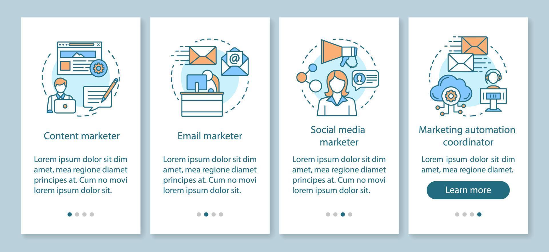 Digital marketing specialties onboarding mobile app page screen with linear concepts. Content, email marketers walkthrough steps graphic instructions. UX, UI, GUI vector template with illustrations Pro Vector