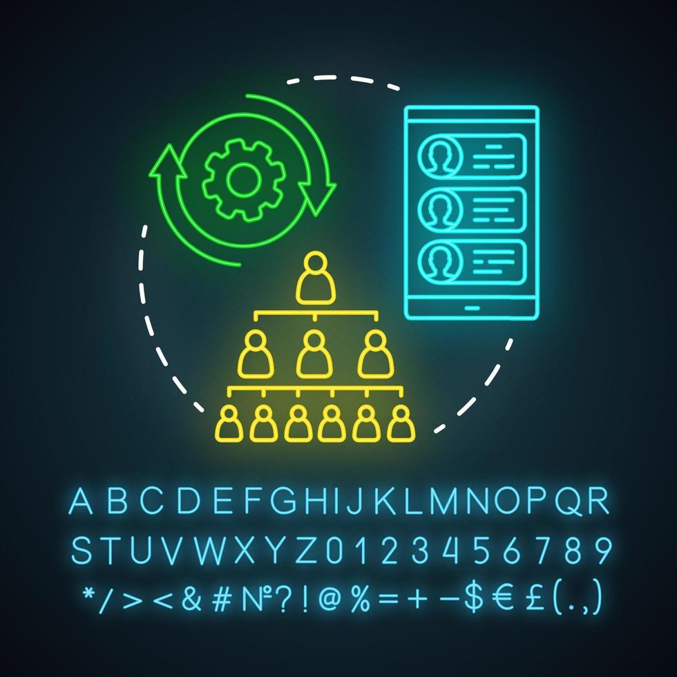 Contact list updating neon light icon. Marketing automation. Mobile device. Renew address book. Contacts screen database. Glowing sign with alphabet, numbers and symbols. Vector isolated illustration Pro Vector