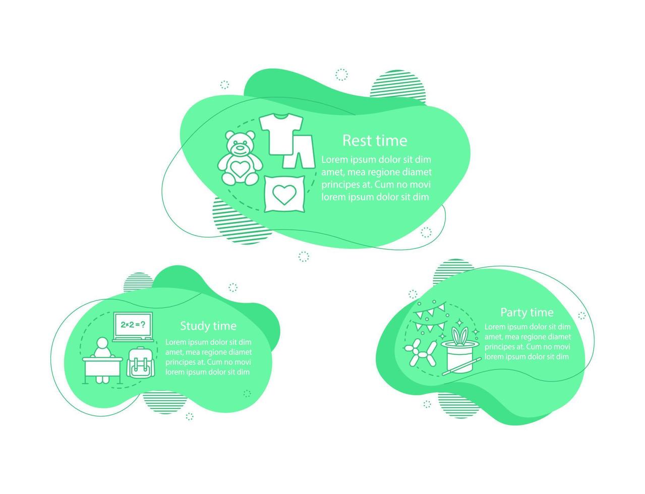 Study, party and rest time concept illustrations. Daily student schedule infographic template. Day planning. Fluid elements with text, linear icons. Wavy bubbles steps. Presentation, banner cliparts Pro Vector