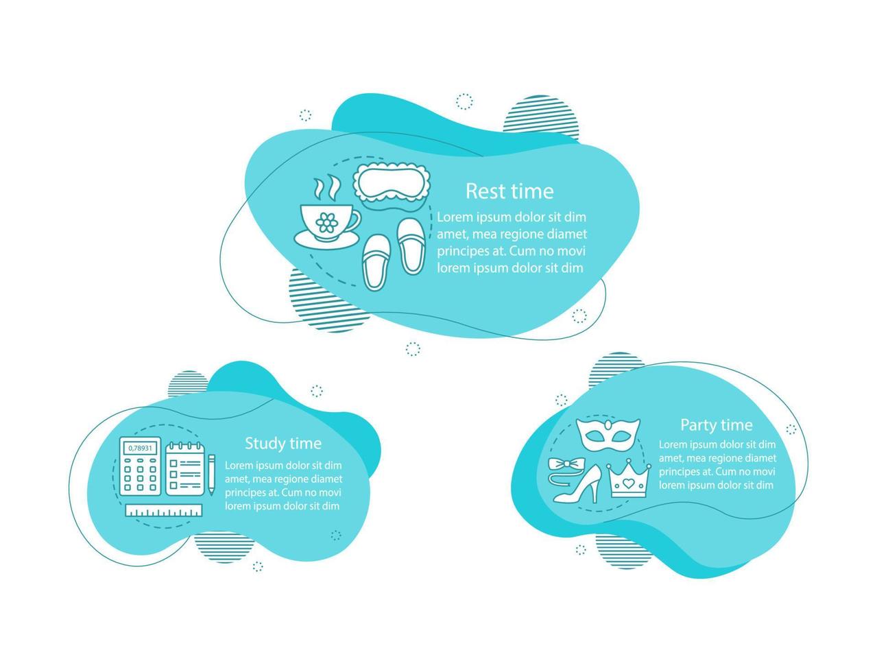 Daily student schedule concept illustrations. Study, party and rest time infographic template. Fluid elements with text, linear icons. Wavy bubbles steps. Presentation, banner report vector cliparts Pro Vector
