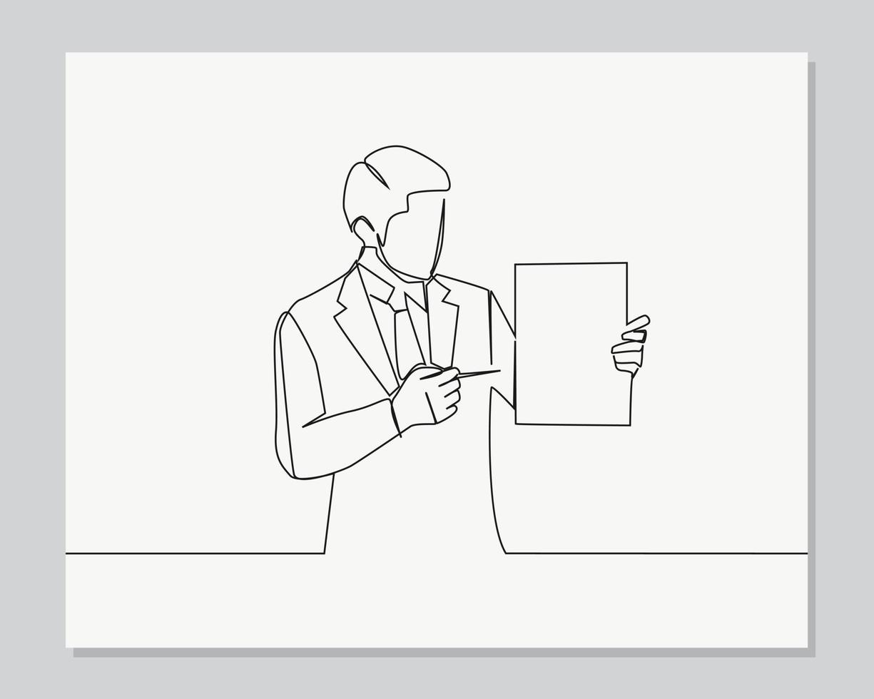 Man in suit standing in office with clipboard continuous one line illustration vector