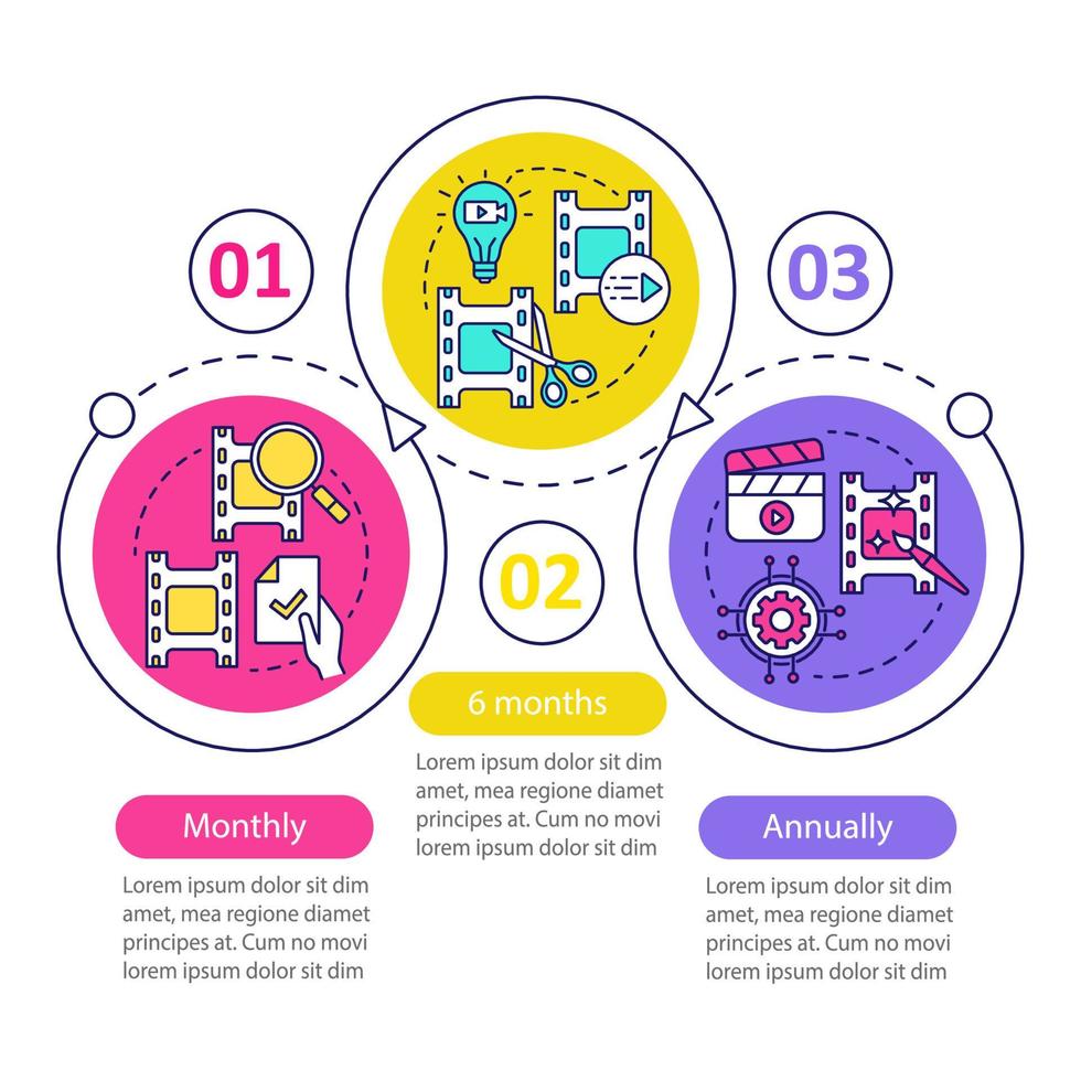 Video editor subscription vector infographic template. Monthly tariff. Business presentation design elements. Data visualization, three steps. Process timeline chart. Workflow layout, linear icons Pro Vector