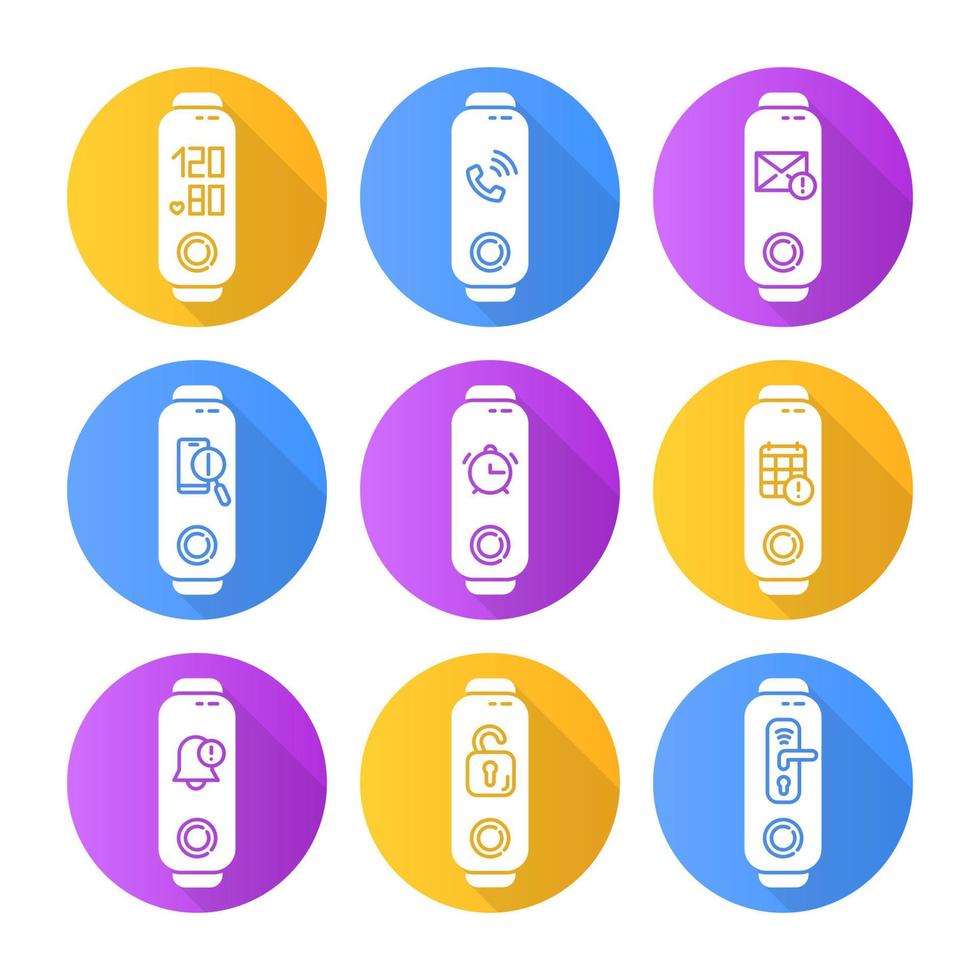 Fitness tracker and smartphone synchronization flat design long shadow glyph icons set. Incoming call and lost phone location option. Alarm clock and calendar pictogram. Vector silhouette illustration Pro Vector