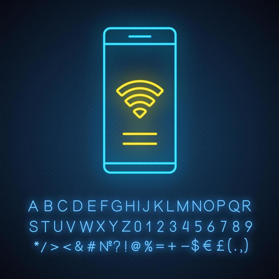 Internet access neon light icon. Wifi zone. Web connection. Smartphone router application. Get online. Free wifi. Glowing sign with alphabet, numbers and symbols. Vector isolated illustration Pro Vector