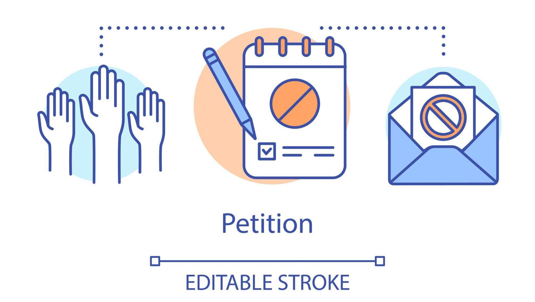Petition concept icon. Signature collection, public opinion demonstration idea thin line illustration. Raised hands, notepad with pencil and envelope vector isolated outline drawing. Editable stroke Pro Vector