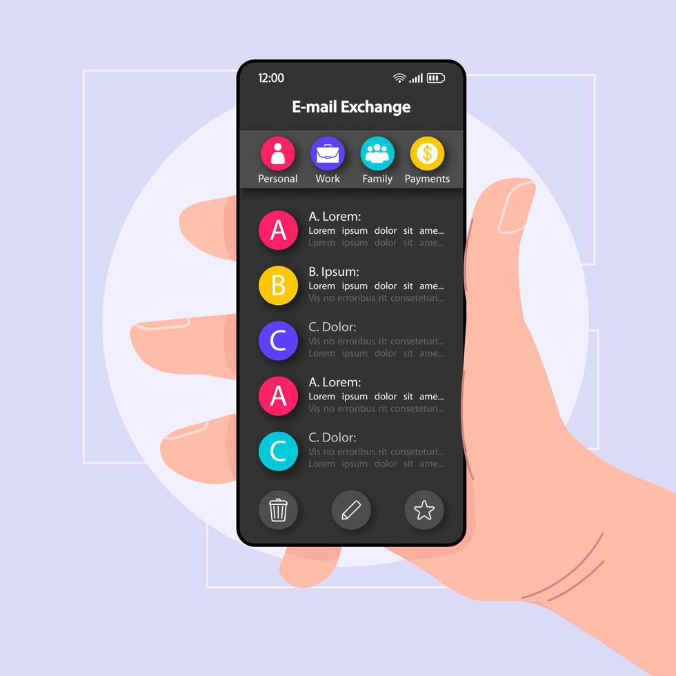 E-mail exchange menu smartphone interface vector template. Mobile app page black design layout. Incoming mail organizer screen. Flat UI for application. Hand holding phone with chats on display Pro Vector