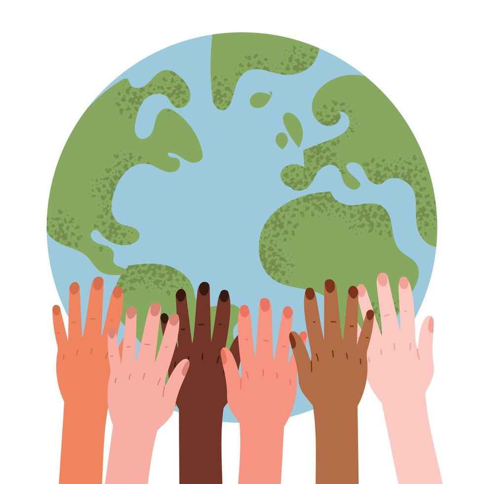 Different hands reaching for the Earth symbolize unity, diversity and global connection. Hand-drawn style. illustration on white isolated background. Pro Vector
