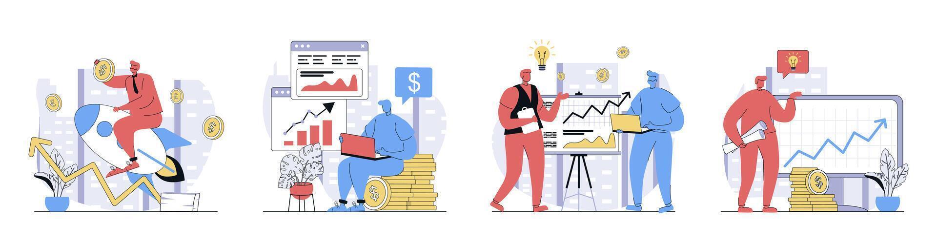 Business growth concept set in flat design for web. Collection with people launch startup company, make data analysis, developing project together, get financial arrow increase. illustrations. Pro Vector