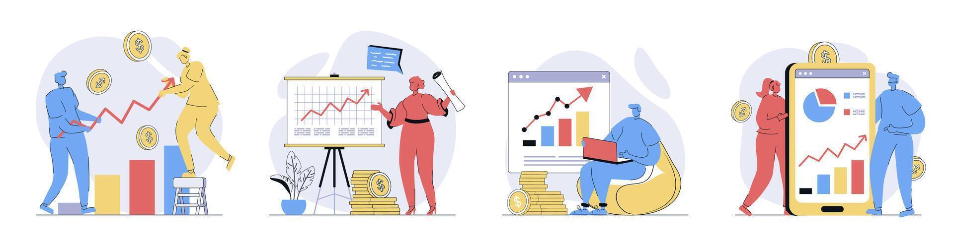 Sales performance concept set in flat design for web. Collection with people making financial analysis, achieving profit rise at arrow charts and graphs, developing business. illustrations. Pro Vector
