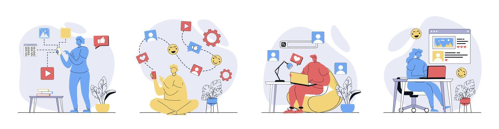 Social network concept set in flat design for web. Collection with people connecting online with internet friends, sharing photos and videos, making online posts, browsing feeds. illustrations. Pro Vector