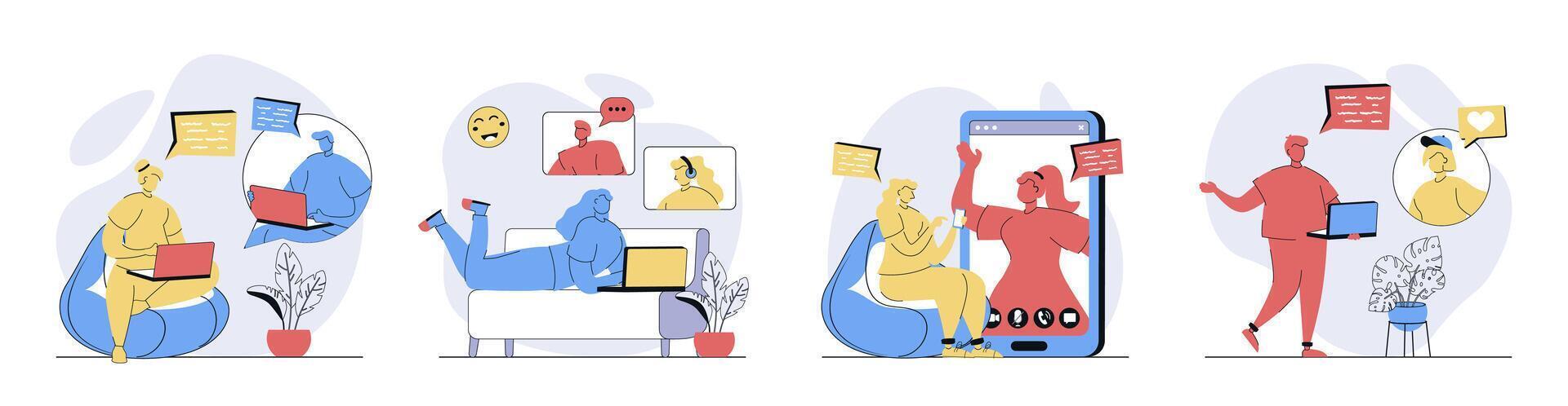chatting concept set in flat design for web. Collection with people connecting online, calling in zoom screens, networking, talking and discussing with internet friends. illustrations. Pro Vector