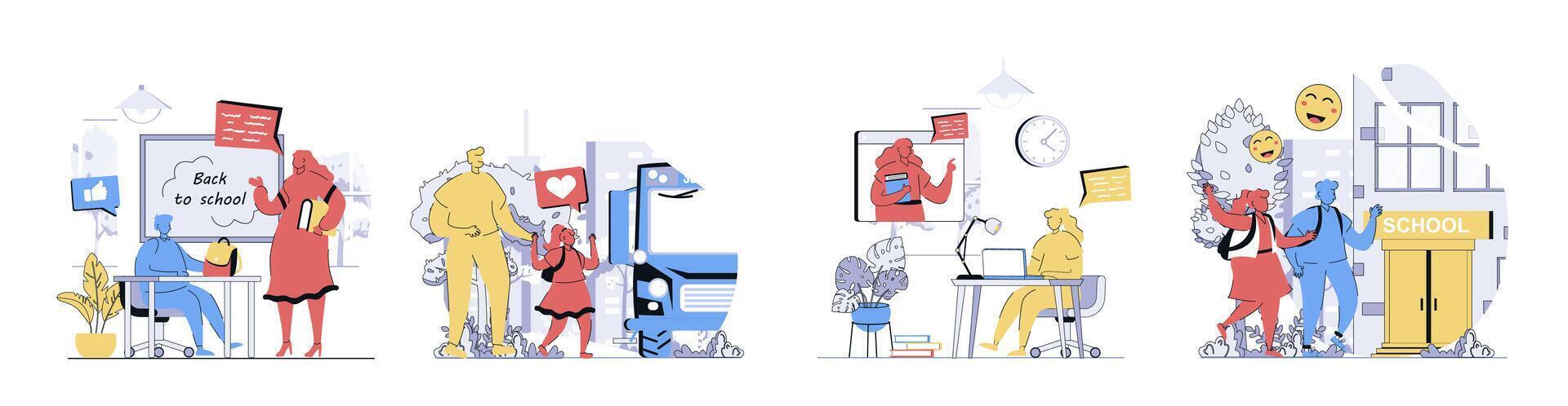 Back to school concept set in flat design for web. Collection with people studying at classes, pupils learning with teacher, parent with kid near bus, student at lecture. illustrations. Pro Vector