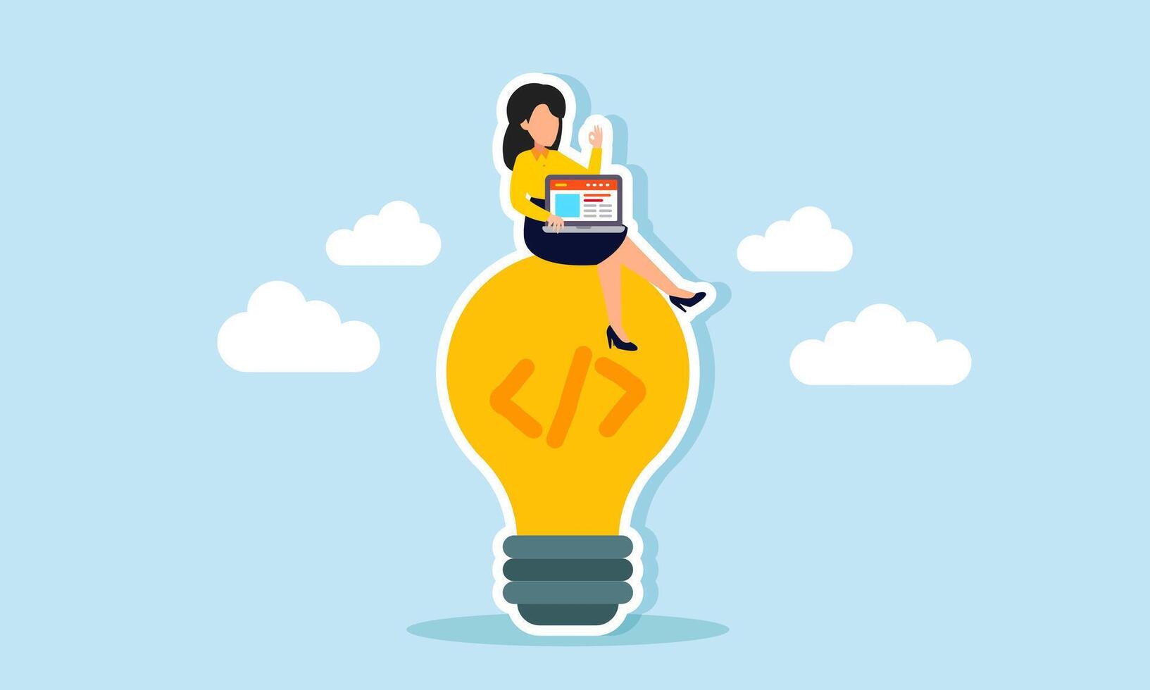 A businesswoman holding a laptop sits on a lamp labeled with a programming sign, illustration of creating programming systems for ideas and innovations relevant to business trends Pro Vector