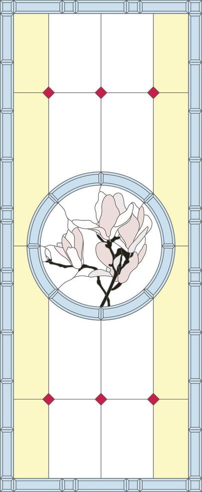Stained glass panel in a rectangular frame. Classic window, with orchid, abstract floral arrangement of buds and leaves in the tiffany technique. Window frame border, geometric pattern Pro Vector