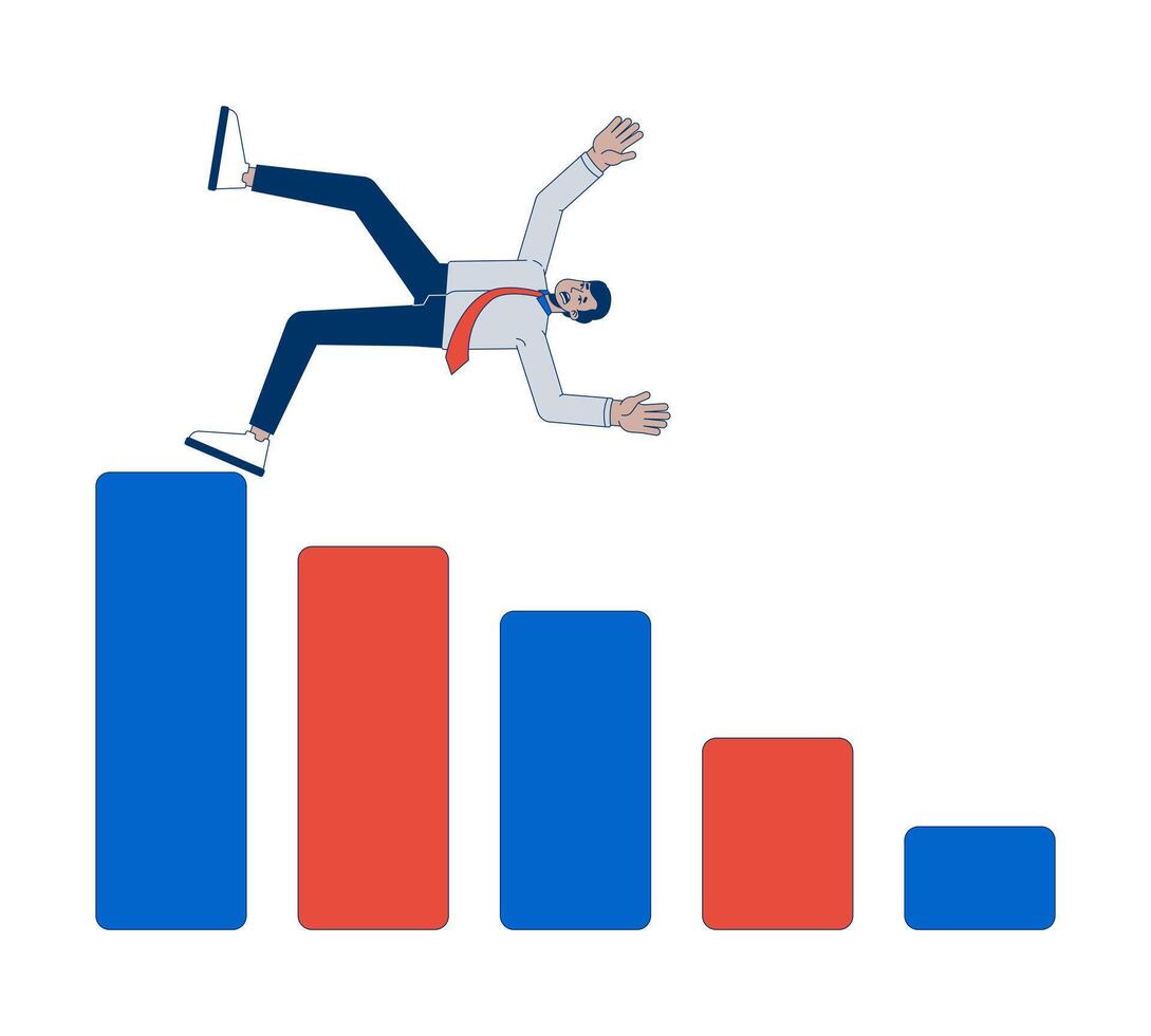 Businessman failure bar chart 2D illustration concept. Barchart fail employee. Office worker falling down from column graph cartoon character isolated on white. Metaphor abstract flat graphic Pro Vector