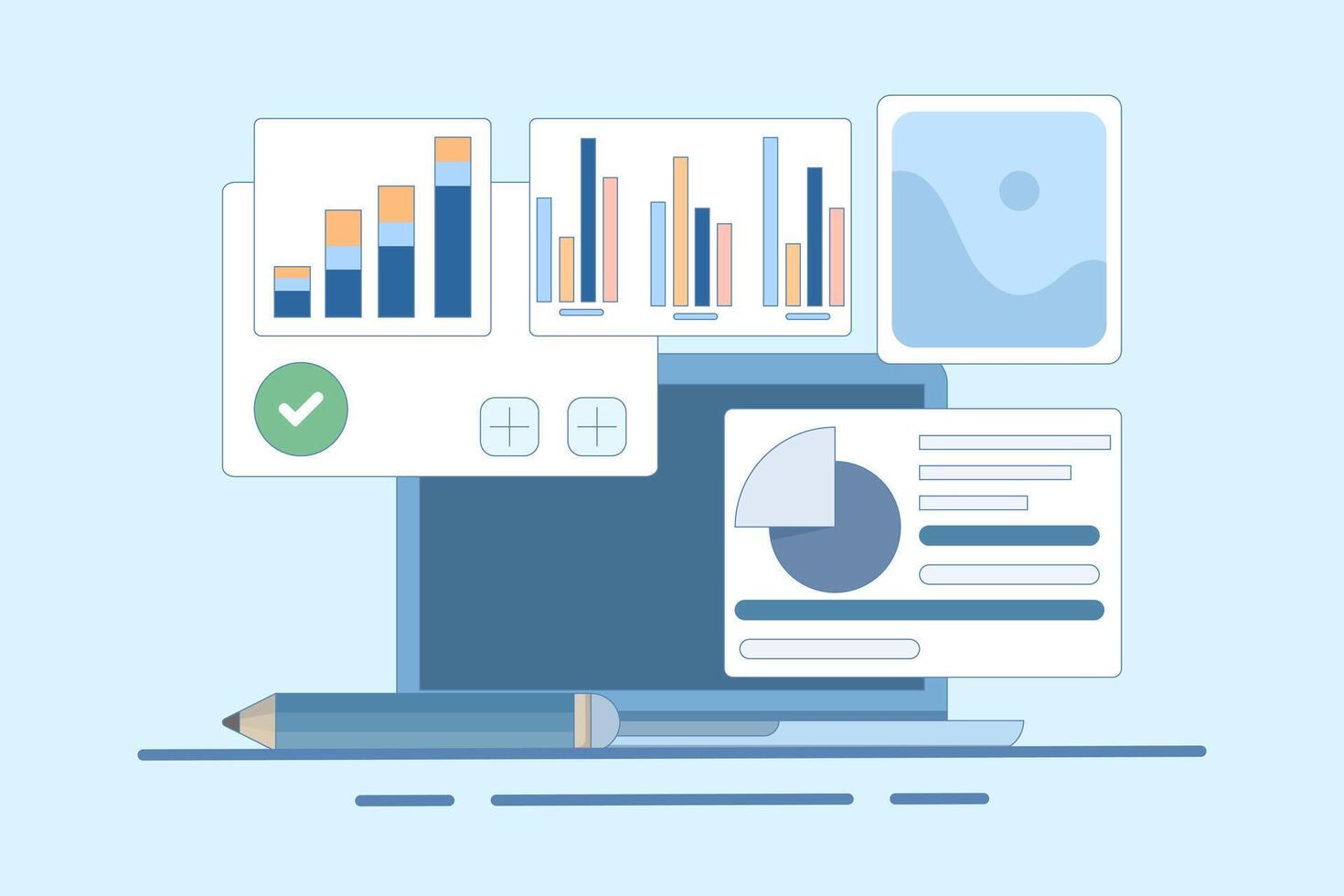 Data Analysis Concept, Creating New Ideas. Business Analysis. Data analysis, audit with mobile app. Digital document research with graphs on device screen. Flat illustration on background. Pro Vector