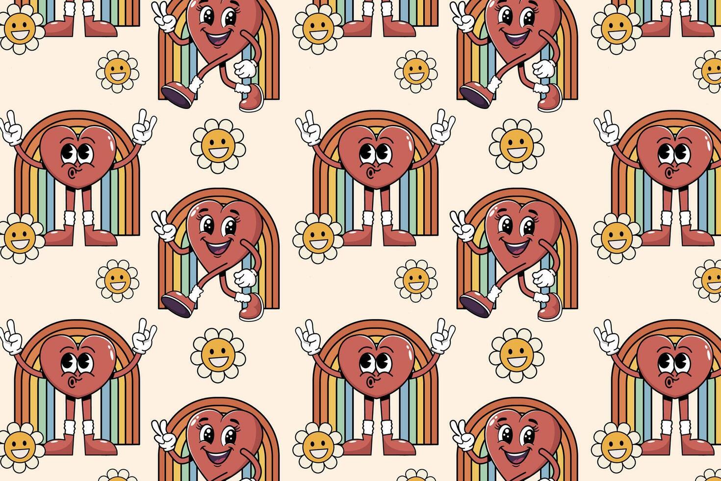 Groovy hippie pattern Valentine's Day heart character, rainbow, daisy. With retro cartoon characters and elements Pro Vector