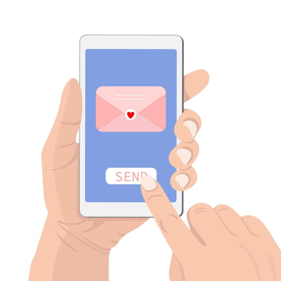 Sending love message concept. Hand held phone with closed envelope with heart, send button. Finger touch screen. Vector flat cartoon illustration for websites, banner design Pro Vector