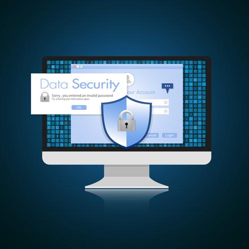 Concept is data security. Shield on computer protect sensitive data. Internet security. Vector Illustration.