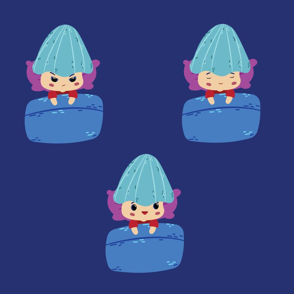 Three mushroom chibi expressions when going to bed after work... angry, grumpy, happy, comfortable and sad Pro Vector