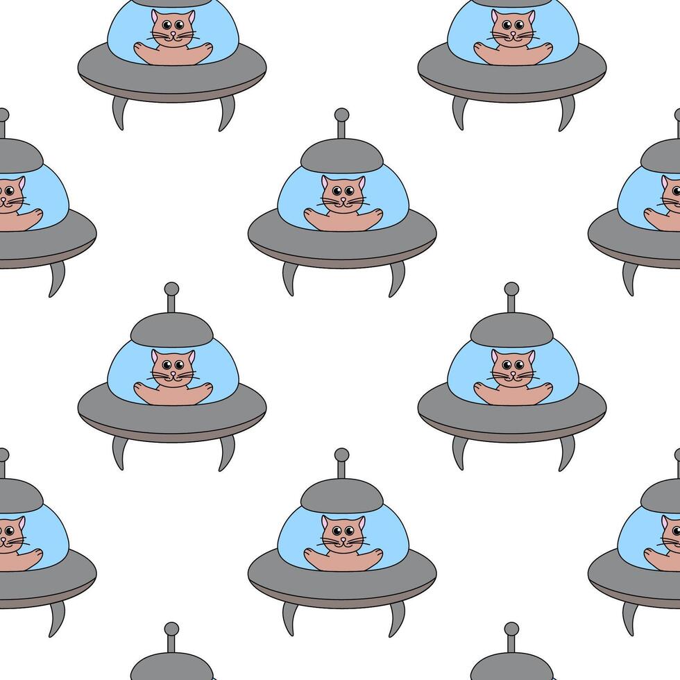Seamless Pattern with funny cat in UFO spaceship. Flat Illustration. Pro Vector
