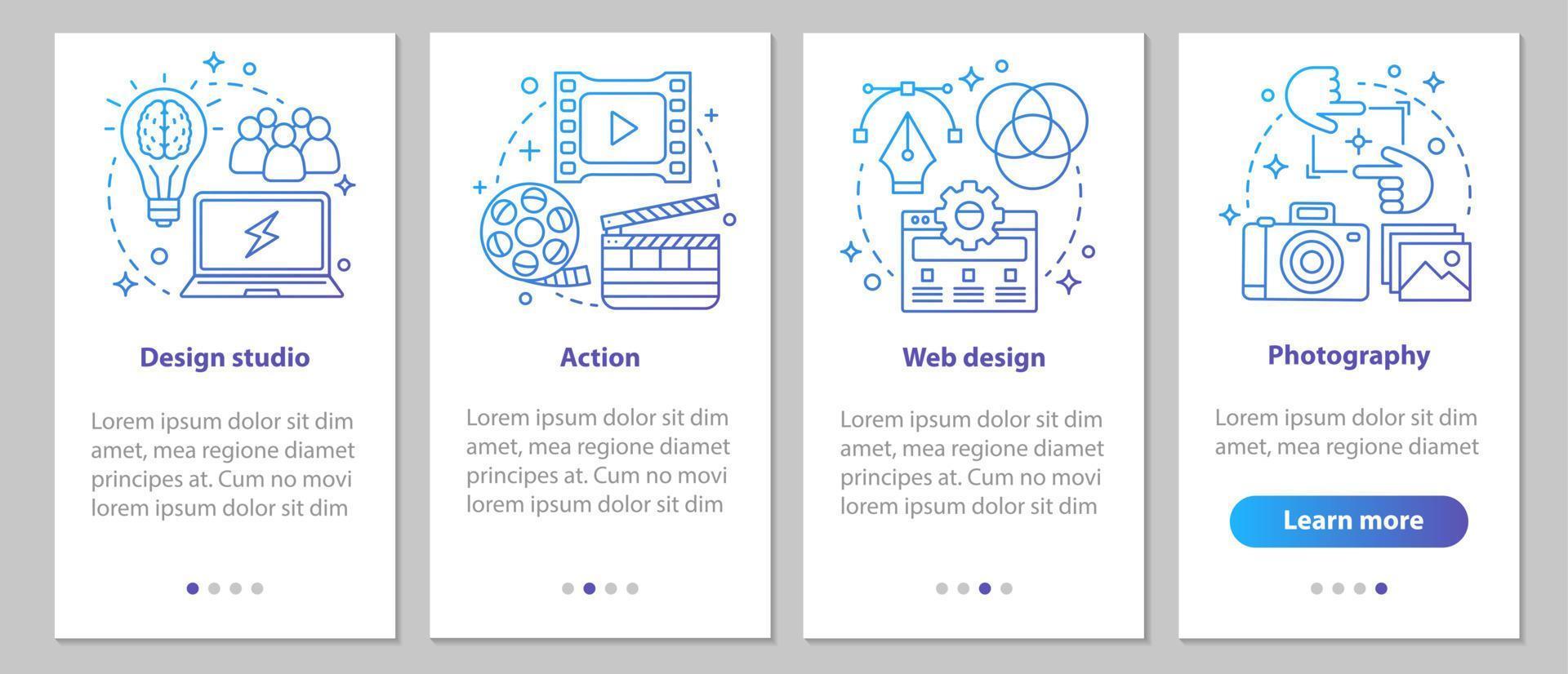 Design studio onboarding mobile app page screen with linear concepts. Action, web design, photography steps graphic instructions. UX, UI, GUI vector template with illustrations Pro Vector