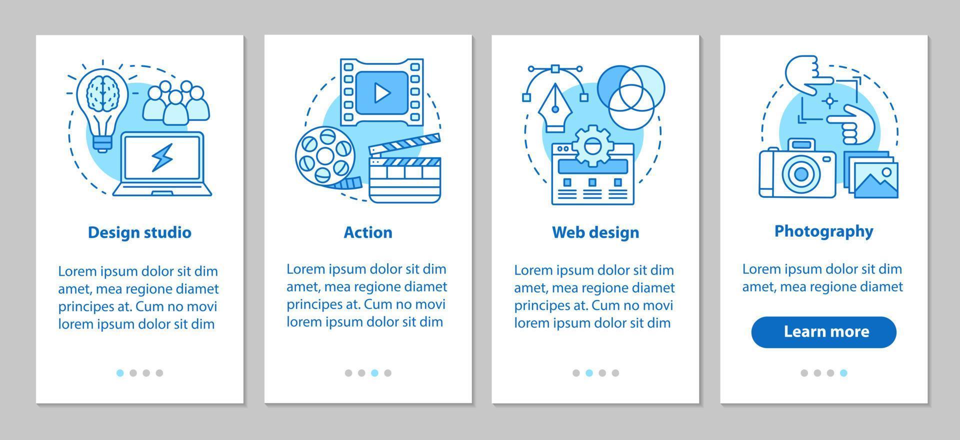 Design studio onboarding mobile app page screen with linear concepts. Action, web design, photography steps graphic instructions. UX, UI, GUI vector template with illustrations Pro Vector
