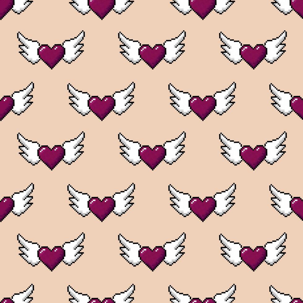 Seamless pattern with hearts with wings pixel icon, 8 bit, retro style. Perfect for wrapping paper for Valentine's Day. Pro Vector