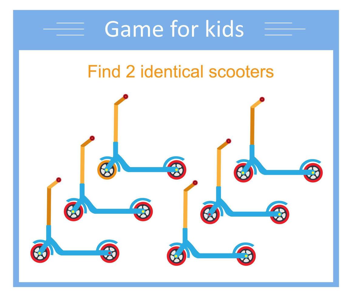 Logic game. Find two identical scooters. Visual intelligence. illustration Pro Vector