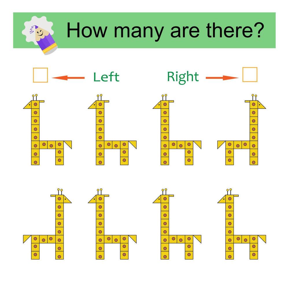 Left or Right. Educational game for kids. Count how many cartoon giraffes are turned left and how many are turned right. Pro Vector