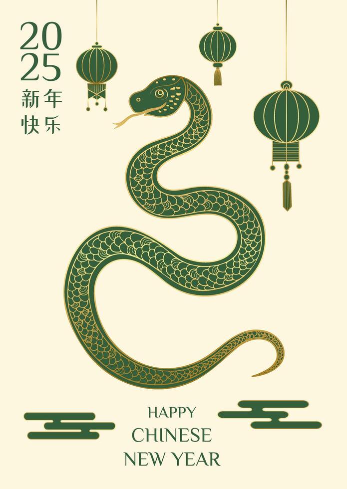 A snake is on a white background with Chinese characters. The snake is green and has a gold stripe Pro Vector