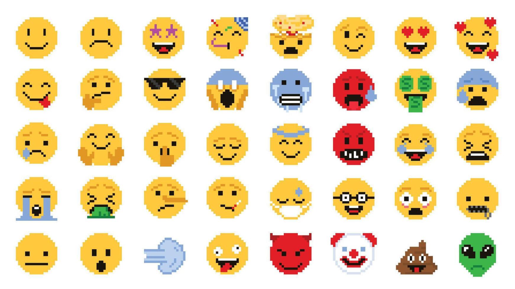 Pixel art emoji. Pixelated emoticon face with different facial expressions, retro arcade game 8 bit emotions and digital messaging smile faces isolated icons set Pro Vector