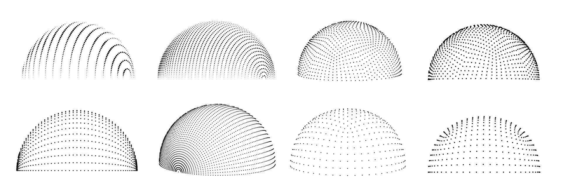 Dotted 3d hemisphere. Dome wireframe dots, geometric half sphere shapes with dotted patterns. Digital power shield, futuristic graphics isolated set Pro Vector