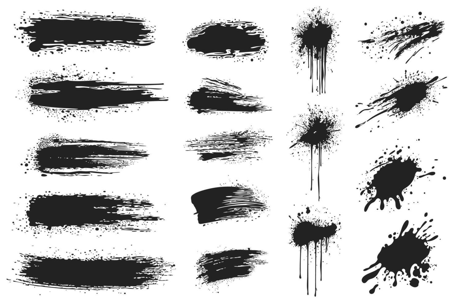 Black ink splatters set elements in flat graphic design. Collection of brush strokes and ink spots with messy grainy texture, grimy paintbrush stains and blobs with rough edges. illustration. Pro Vector