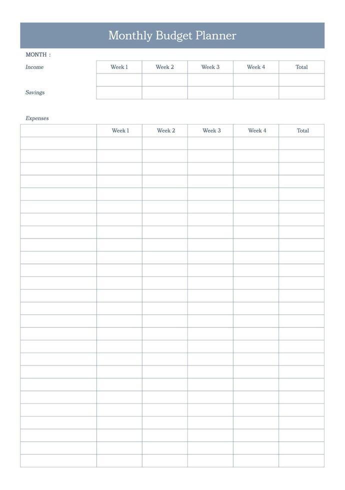 Clean and simple monthly budget planner with a basic, simple and professional designs. Ideal for individuals seeking to enhance their budgeting skills and financial literacy. User-friendly layout. Pro Vector