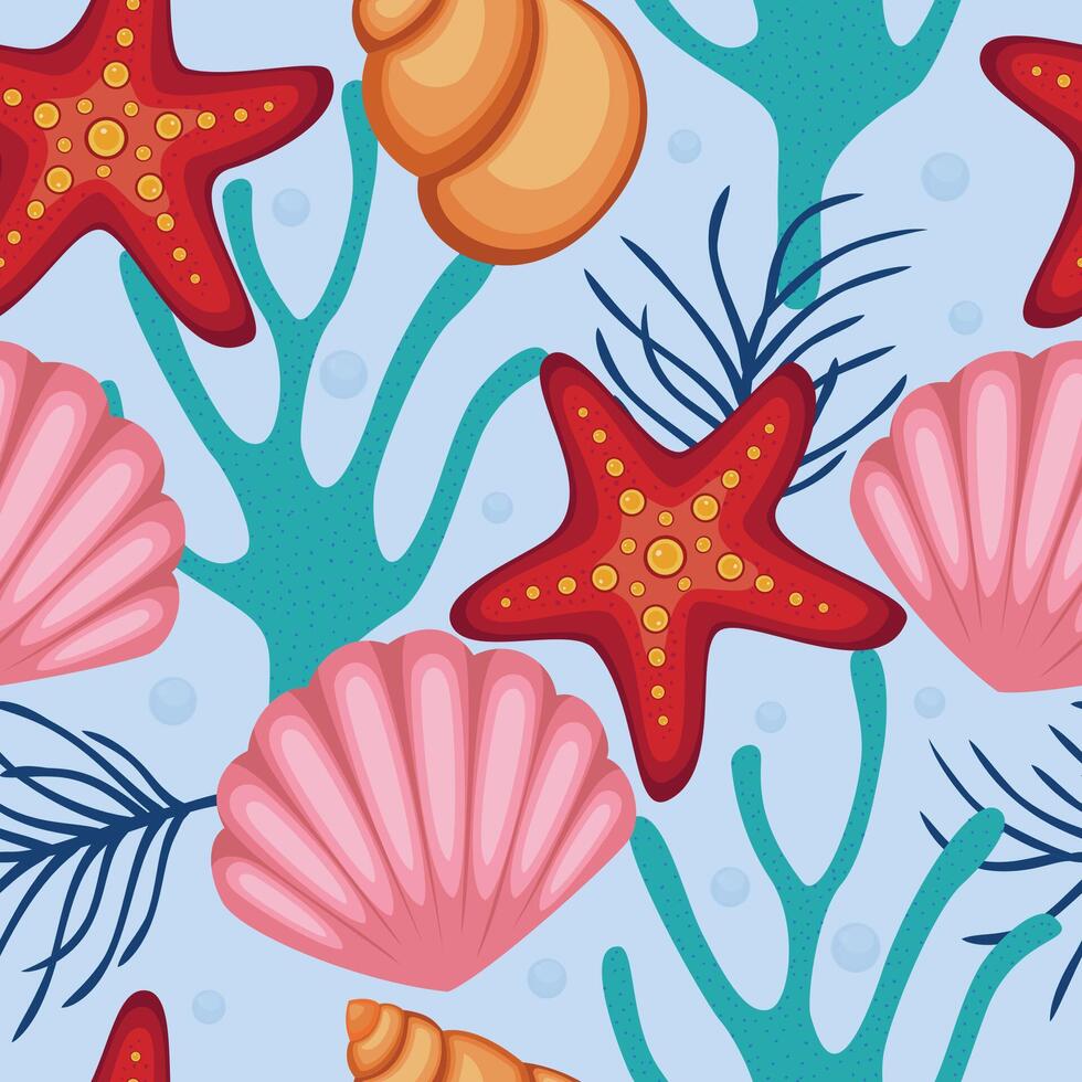 Starfish, seashells and shell Seamless pattern on blue background Pro Vector