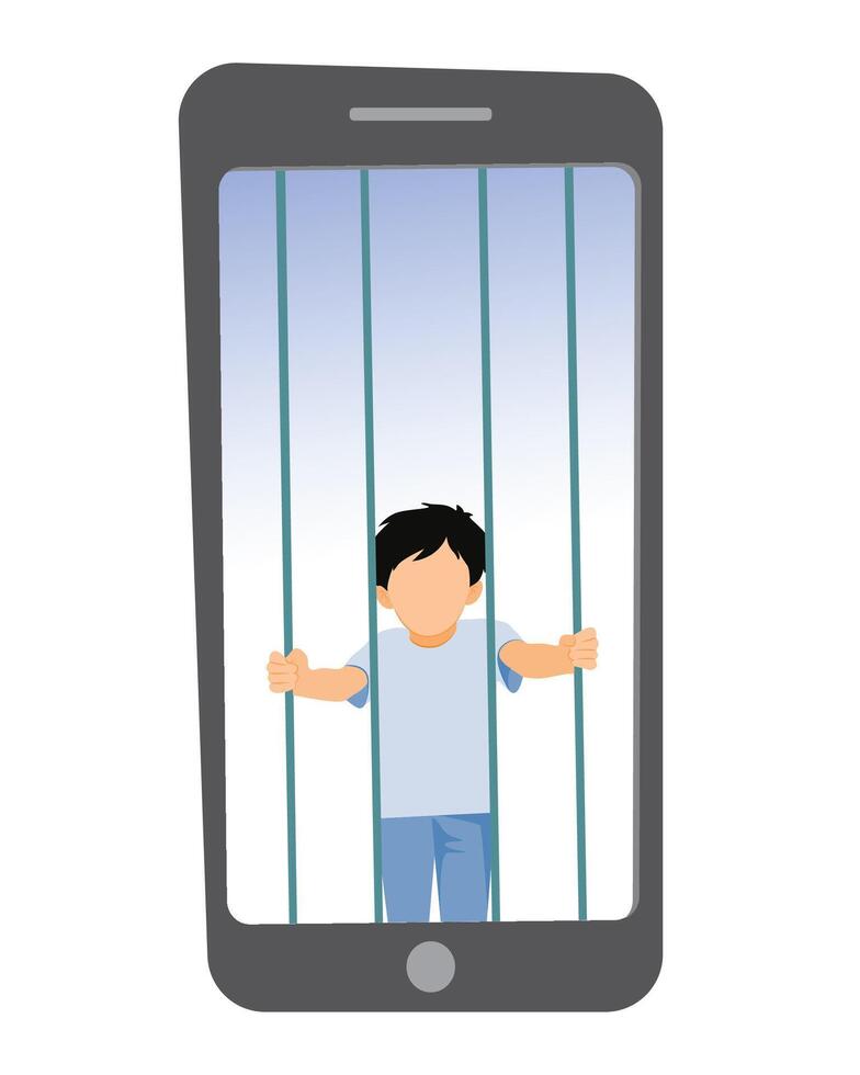 Kids imprisoned in a smartphone, symbolizing the addiction and dependency on mobile devices Pro Vector