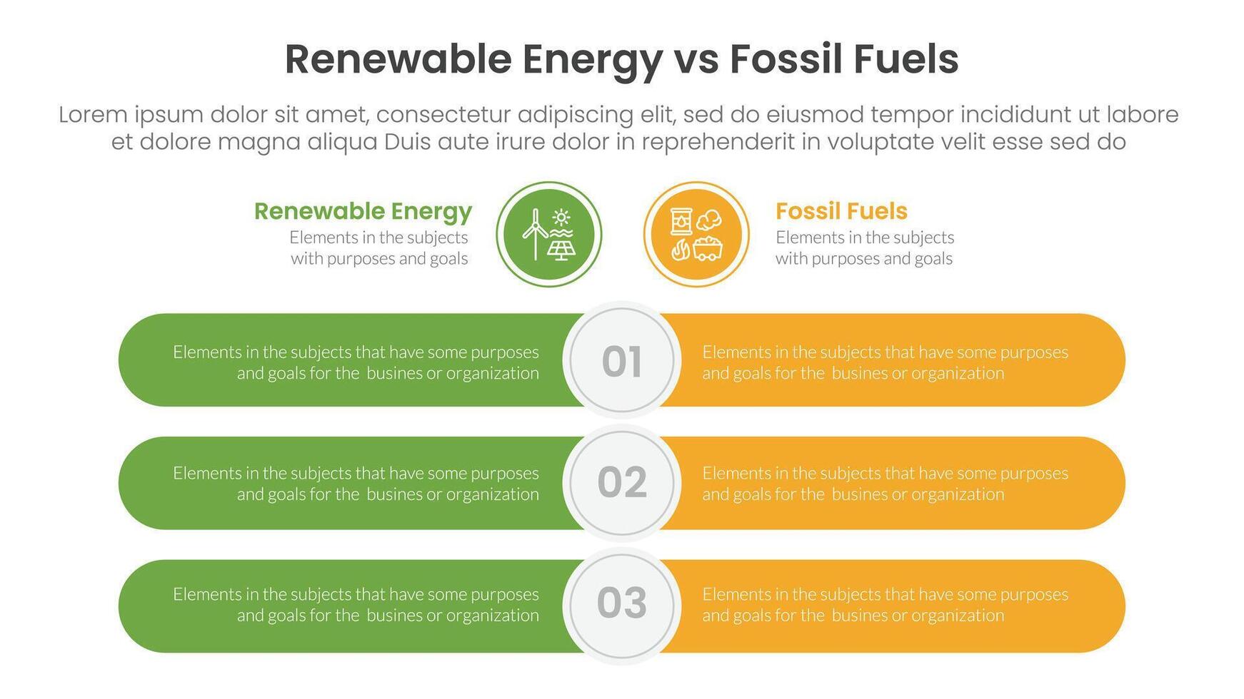 Renewable energy vs fossil fuels comparison concept for infographic template banner with round rectangle bar opposite with two point list information Pro Vector