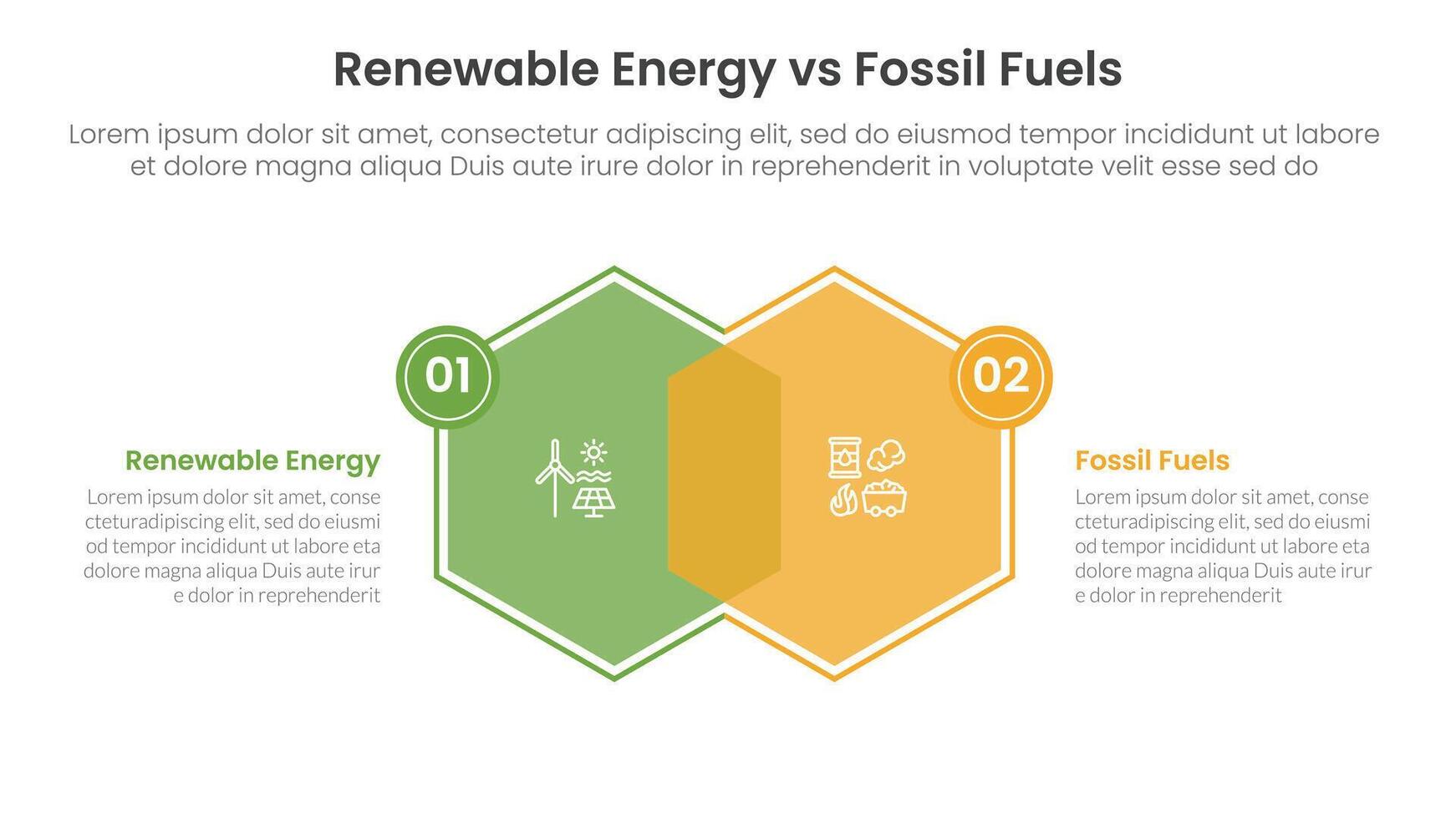 Renewable energy vs fossil fuels comparison concept for infographic template banner with hexagon venn blending and small badge side with two point list information vector