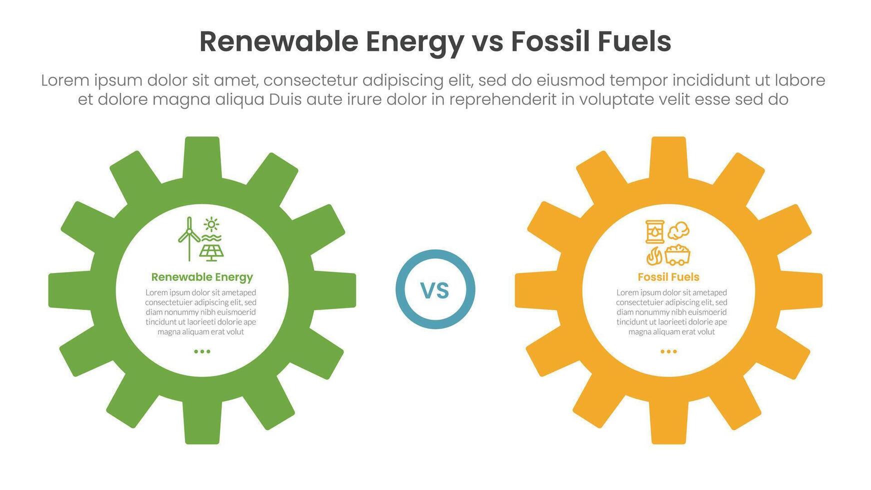 Renewable energy vs fossil fuels comparison concept for infographic template banner with big gear side by side with two point list information vector
