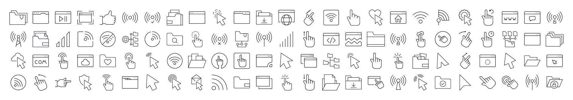 Computer Desktop Line Icon Set. Modern Collection for Design, Web Sites, Apps, Cards. Contains Linear Images of Cursor, Wi Fi Waves, Folders, Web Pages Pro Vector