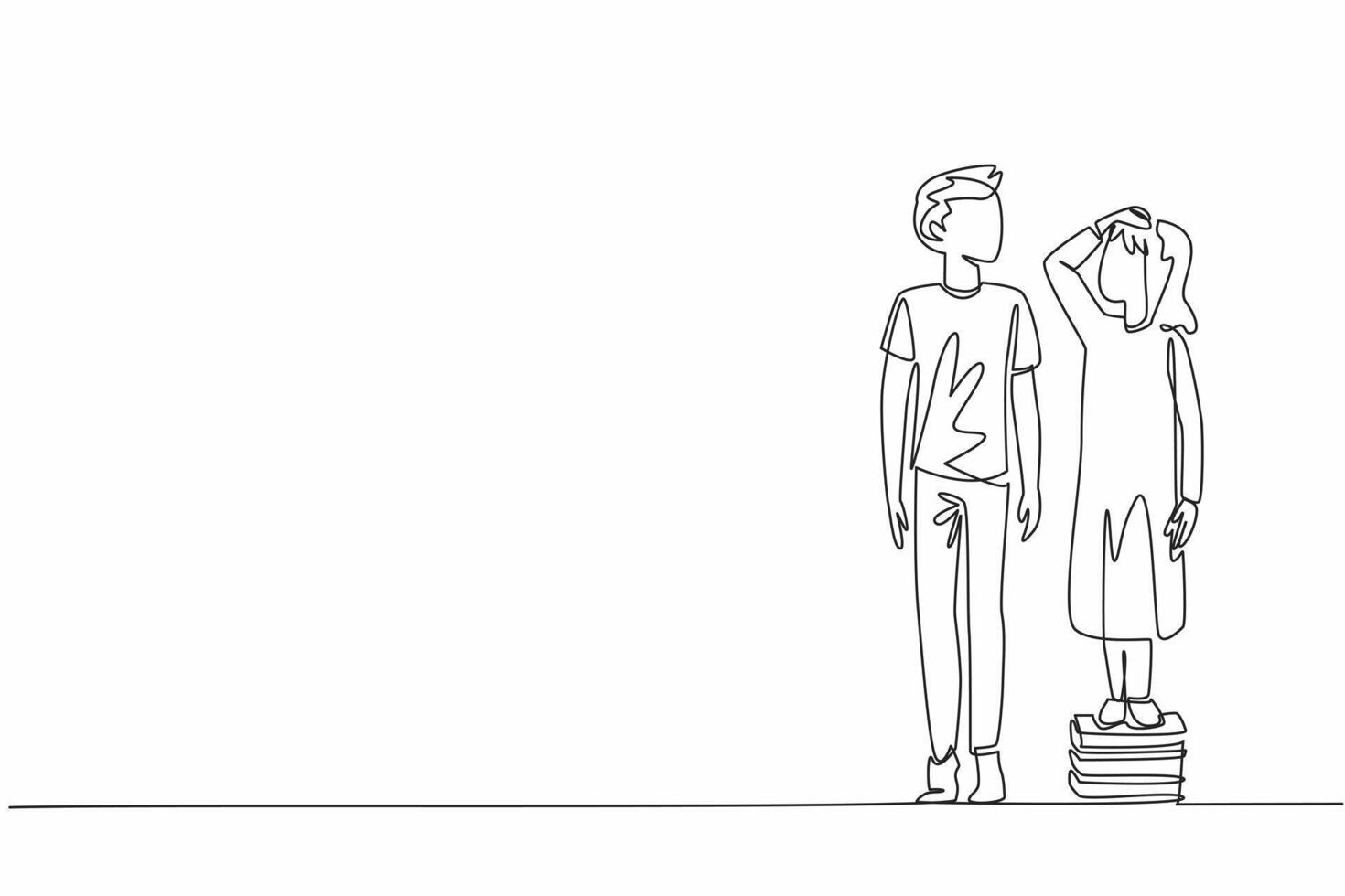 Continuous one line drawing older brother stands on tiptoe while younger sister stands on a pile of books. Want to be on same level. National Siblings Day. Single line draw design illustration Pro Vector
