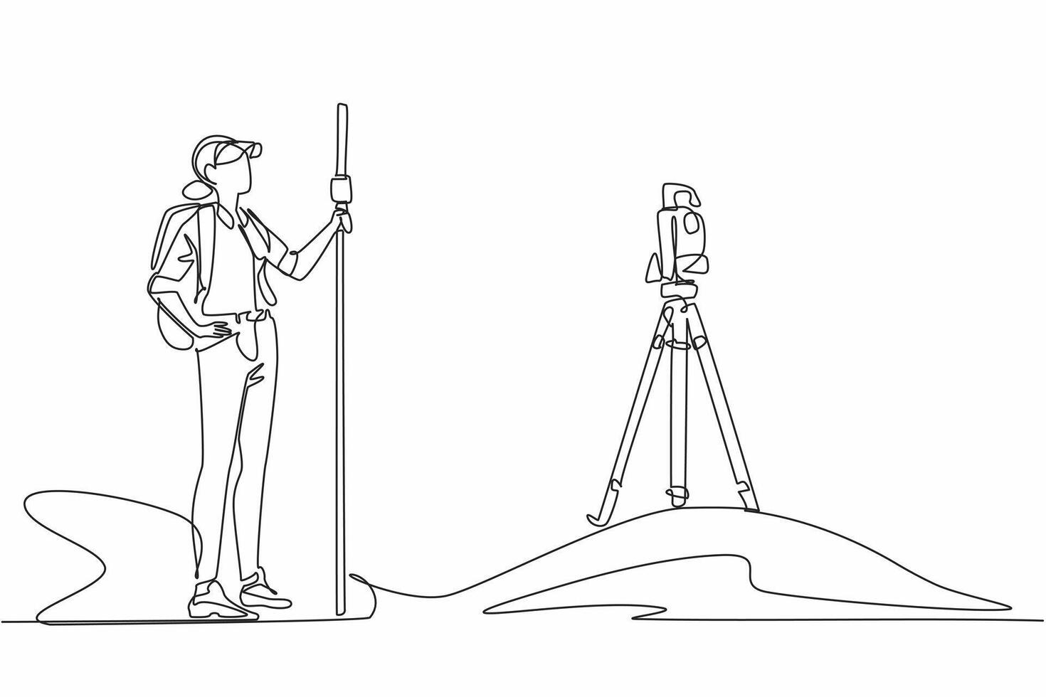 Continuous one line drawing a woman measures land using total station. The expert who is making the mapping. Measure angles automatically. Geologists Day. Single line draw design illustration Pro Vector