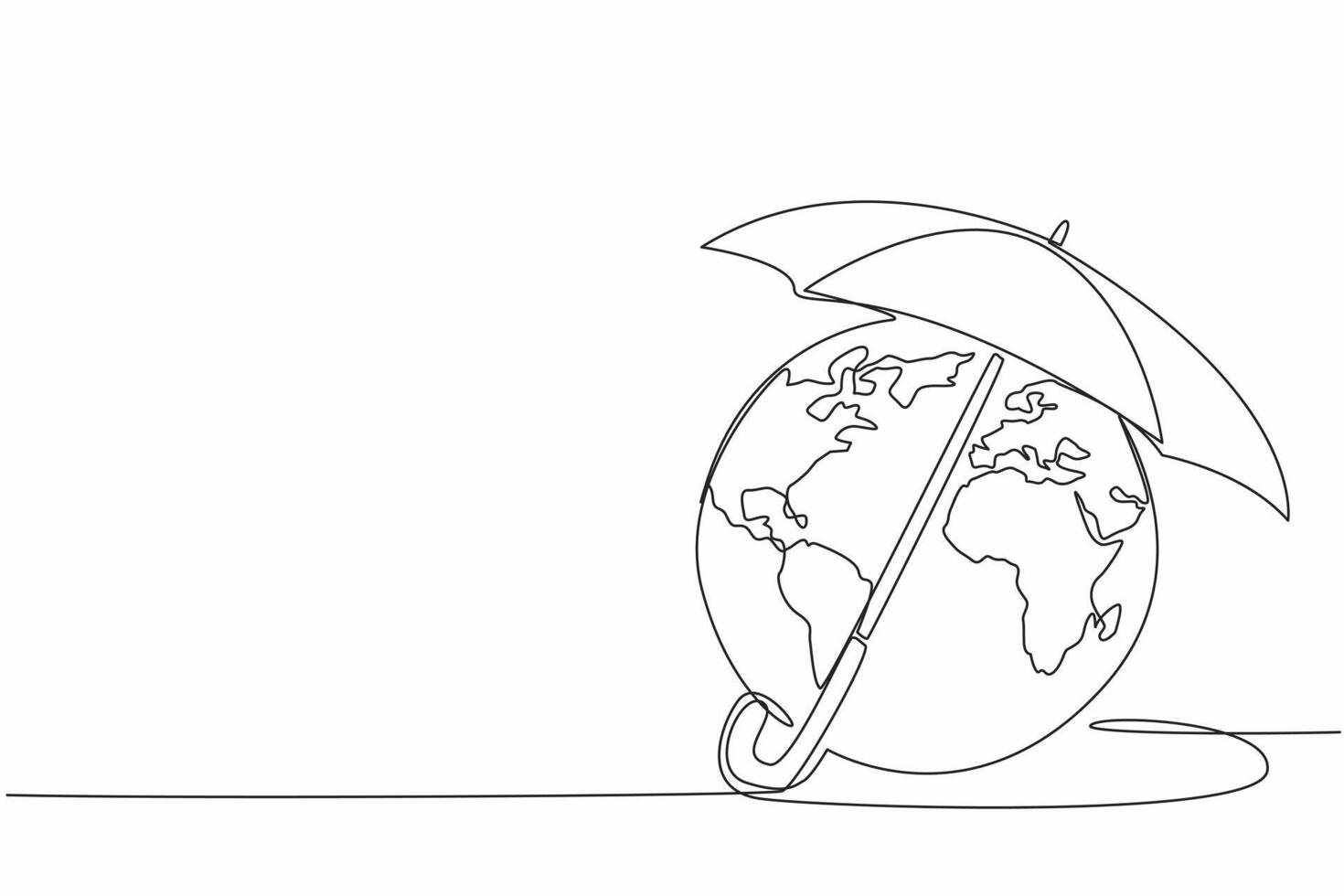 Single continuous line drawing part of the globe is covered by an umbrella. Take shelter with umbrella whether it is raining or hot. Tech. World Meteorological Day. One line design illustration Pro Vector
