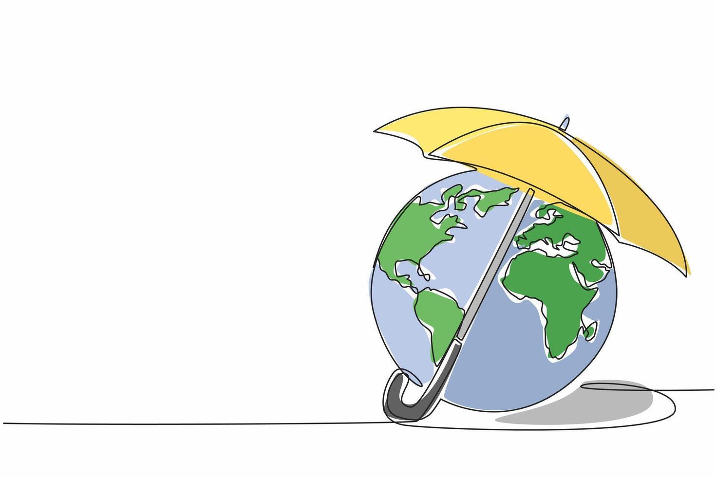 Single continuous line drawing part of the globe is covered by an umbrella. Take shelter with umbrella whether it is raining or hot. Tech. World Meteorological Day. One line design illustration Pro Vector