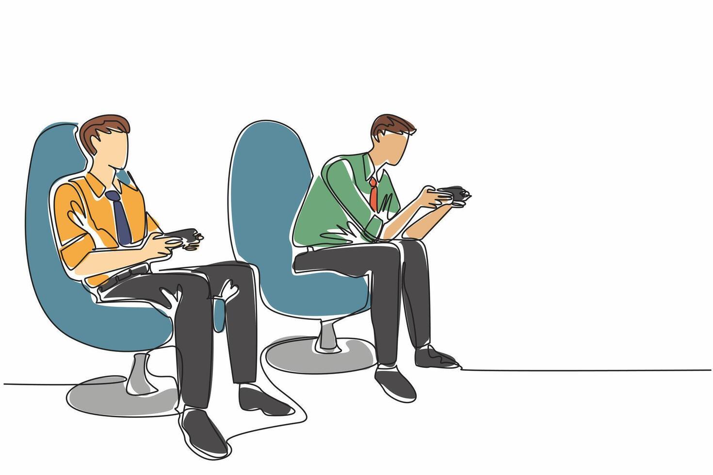Single continuous line drawing two business men holding wireless game console sticks. Playing football games at the office. Lazy day at work. National Goof Off Day. One line design illustration Pro Vector