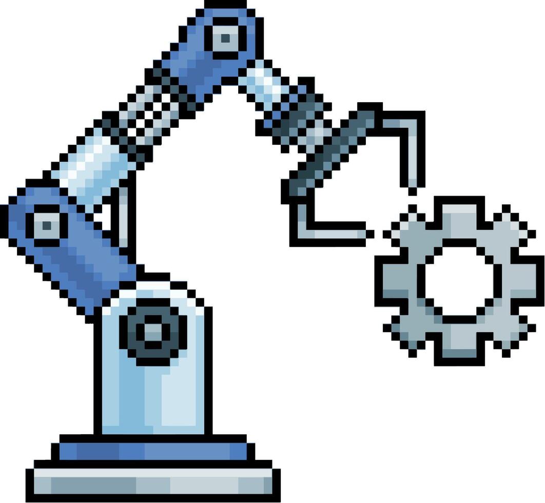 Pixel art of a robotic arm with gear in 8-bit style on white background Pro Vector